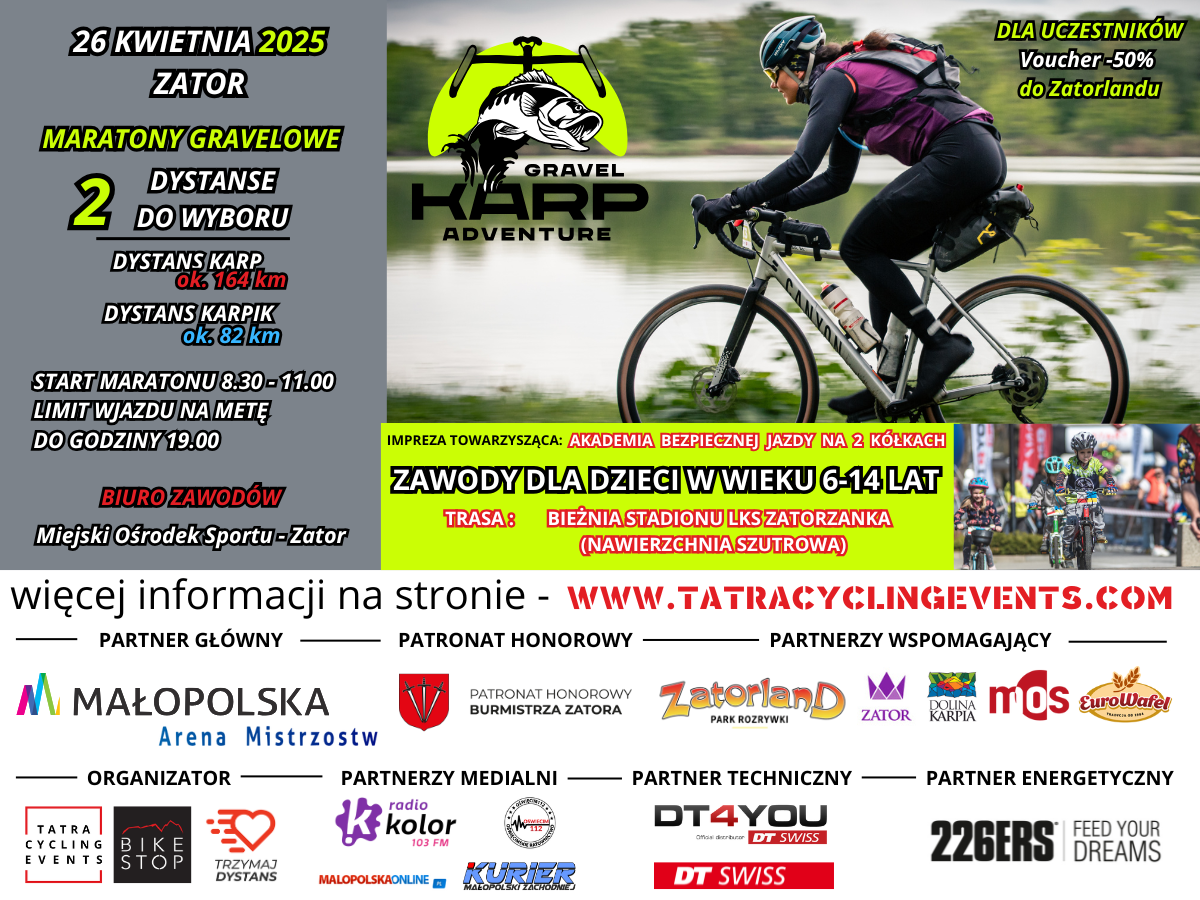 Każdy uczestnik dorosły i dziecko otrzyma w pakiecie kupon obejmujący 50% zniżki na bilety do wspaniałego Parku Rozrywki Zatorland, który jest Partnerem wydarzenia i znajduje się bezpośrednio przy miasteczku zawodów, tak więc zapraszamy całe rodziny, nikt nie będzie się nudził. Dodatkowo będziemy przyswajać najmłodszym zasady bezpiecznej jazdy na rowerach, zwracać uwagę na stan techniczny rowerów i prowadzić prezentacje z pierwszej pomocy.